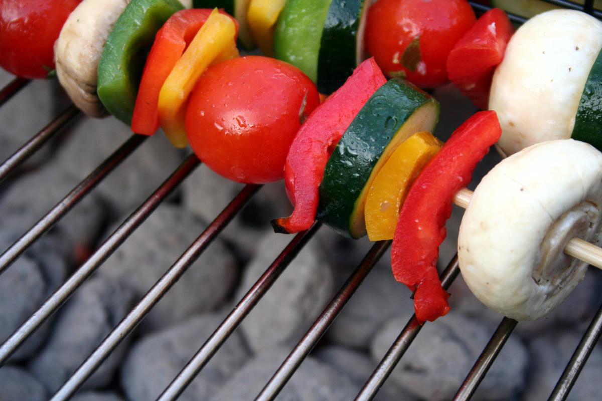 Thread mushrooms, tomatoes, bell peppers, onion and zucchini onto skewers. Place skewers onto a baking sheet. Brush olive oil mixture onto the skewers and let sit for 10-15 minutes.