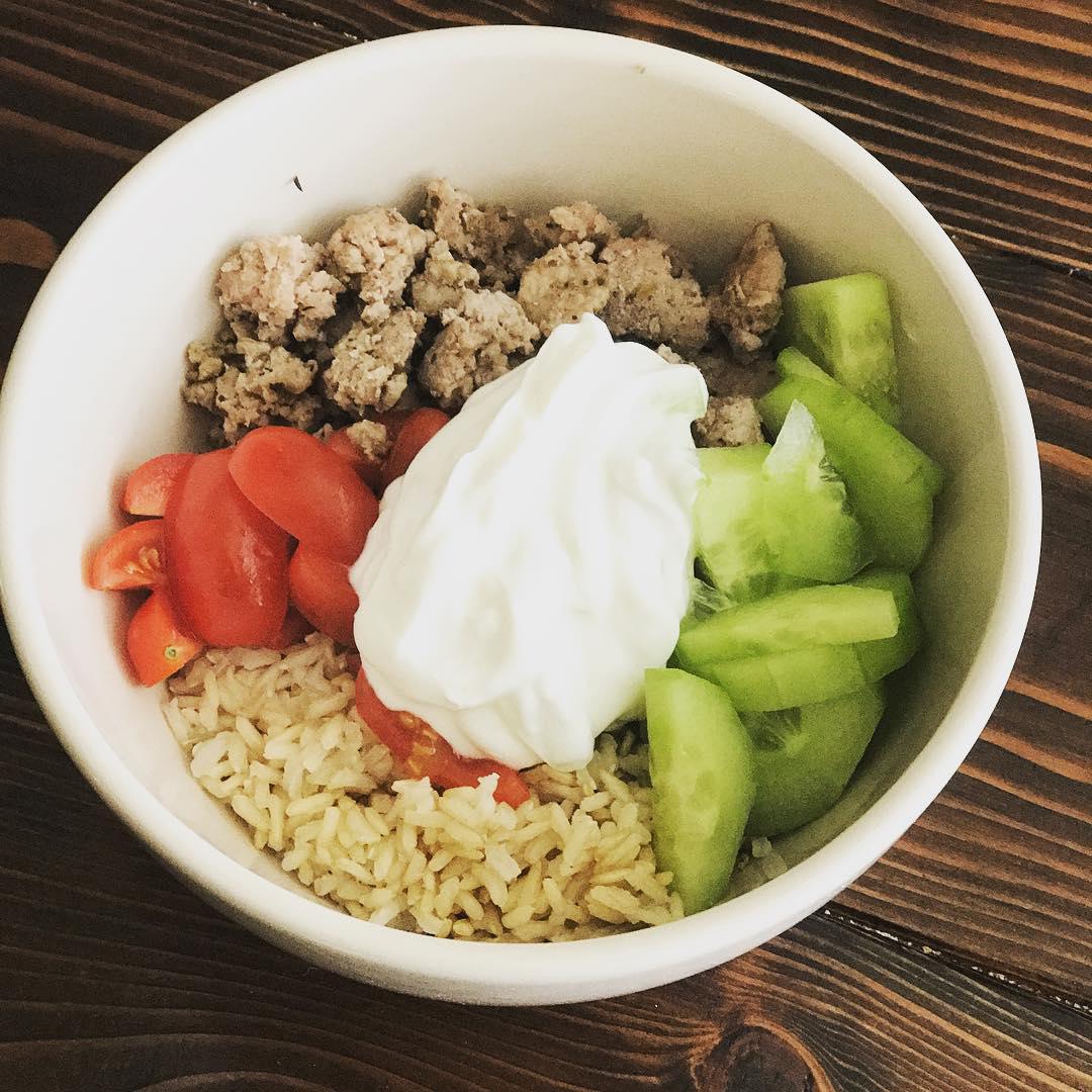 Season meat to taste, save remaining seasoning mix. Prepare rice according to directions on rice. Cook turkey in saute pan with cooking spray. Slice cucumbers and tomatoes. For the tzatziki sauce, add Greek yogurt, grated cucumber, lemon juice, dill, and garlic powder to a small bowl. Mix together until everything is combined. Salt to taste. Assemble in bowl, top with tzatziki sauce, and enjoy!