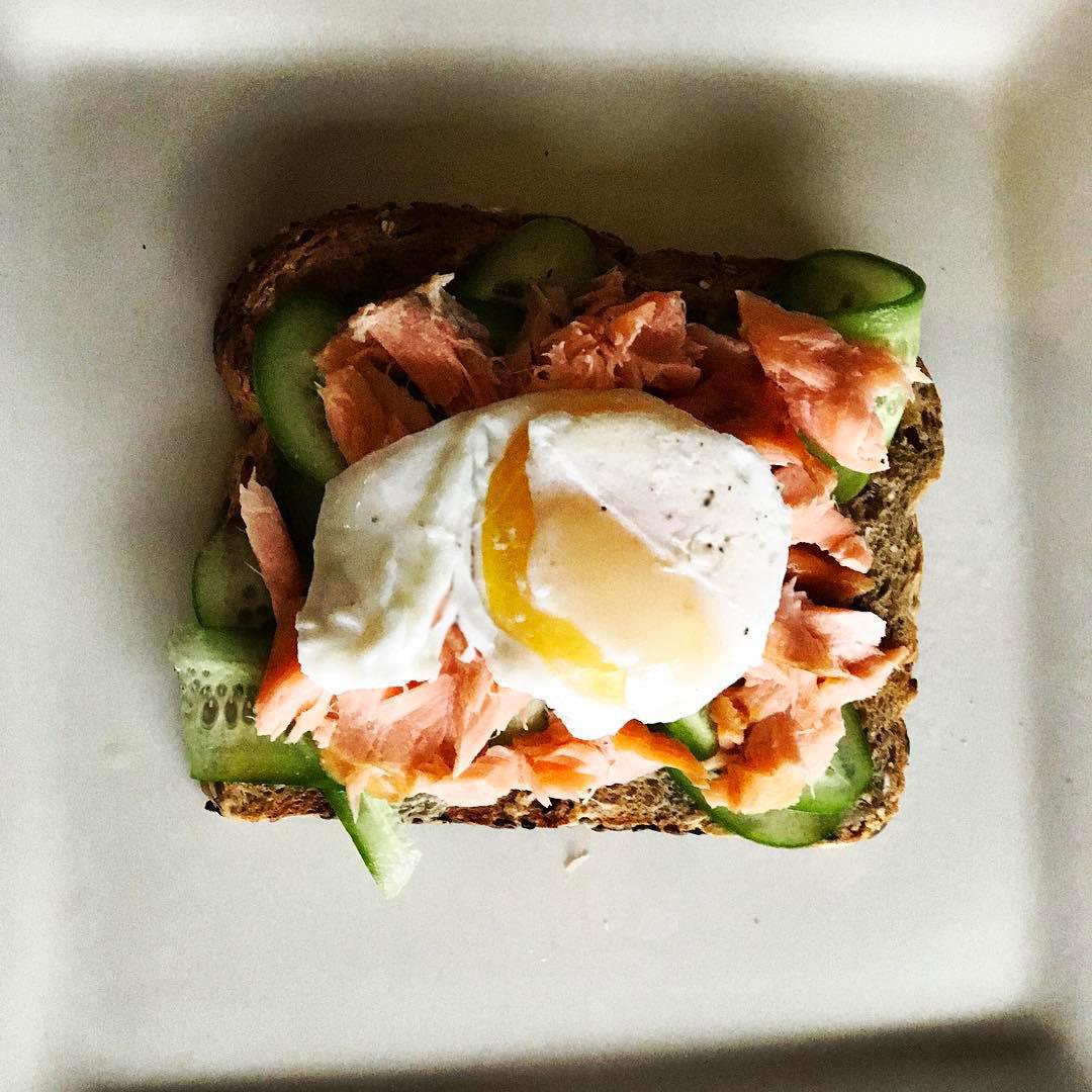 Cook salmon and pull apart in thin pieces on top of toasted bread, cook egg, assemble, and enjoy!