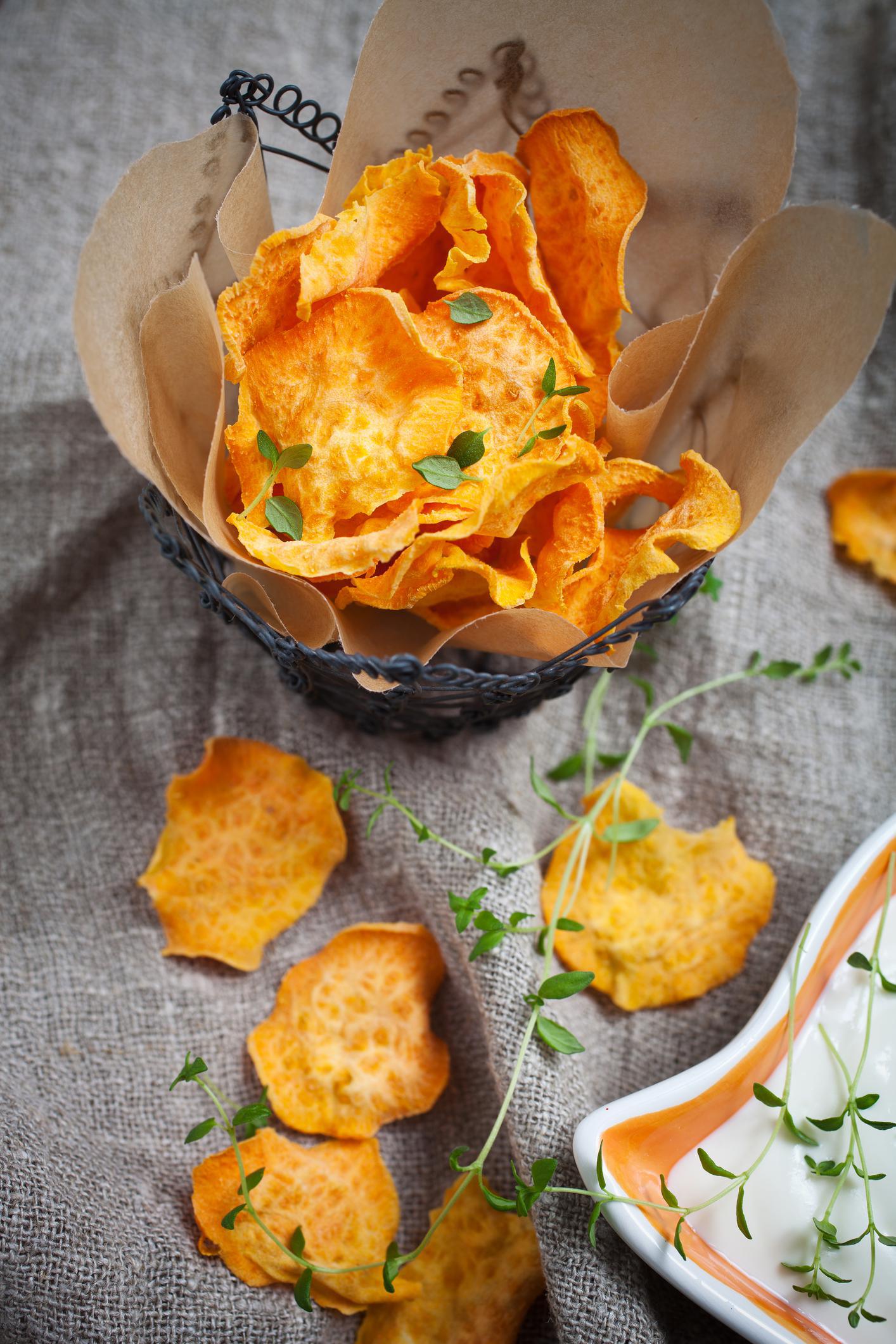 Preheat the oven to 400 degrees F. Line several baking sheets with parchment paper and set aside. Use a mandolin slicer to cut the sweet potatoes into paper-thin rounds. You can also use a knife to do this.
